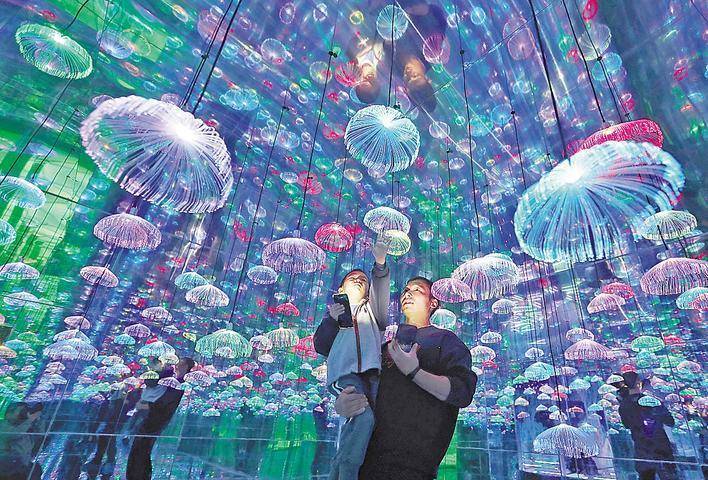 荆门园博园内,搭客在水母灯群中驻足。 (湖北日报通信员 赵平 摄)