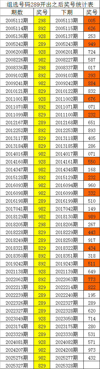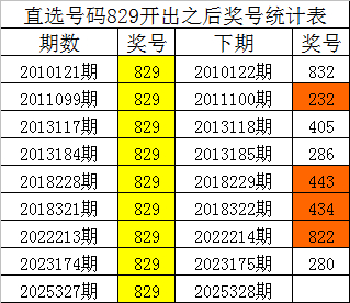 从上表统计不错看出,直选号码829开出之后,其下期奖号: